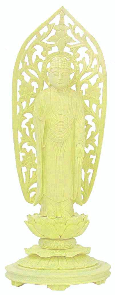 仏像 阿弥陀如来 立像(浄土宗)【白木 丸台座】唐草光背 3寸5分