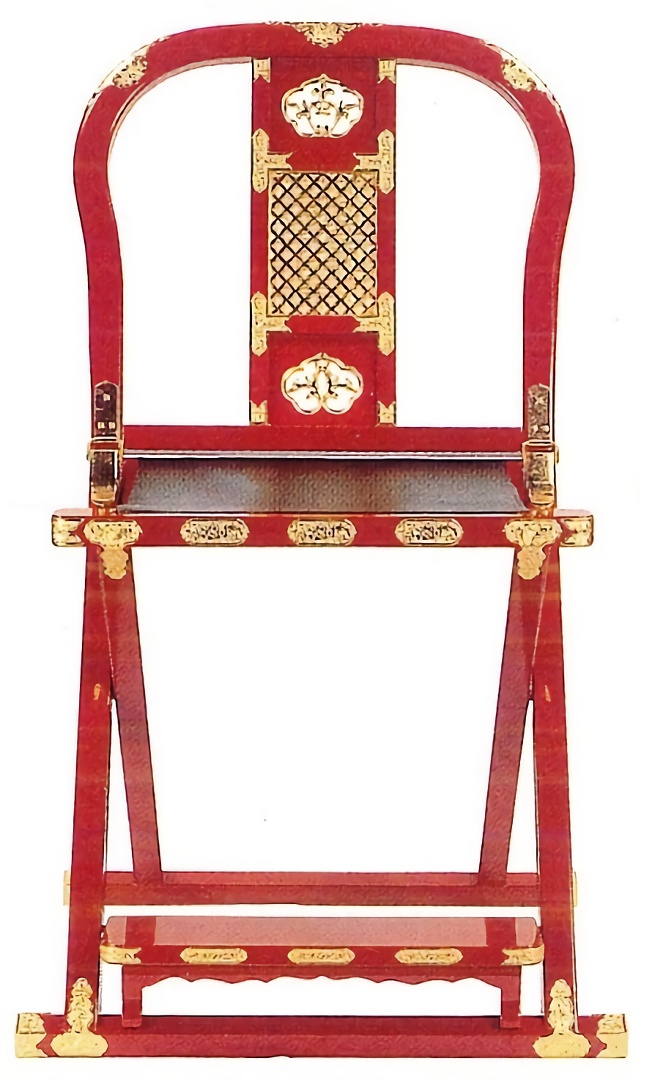 背もたれを折りたたんで、持ち運びできる曲録です。