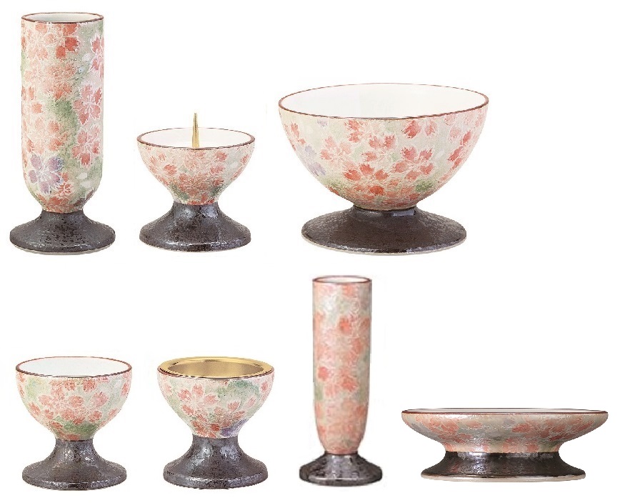 有田焼の七具足です。なでしこの図柄です。花立・火立・香炉・茶湯器・仏器・線香差(大)・供物台の7点です。