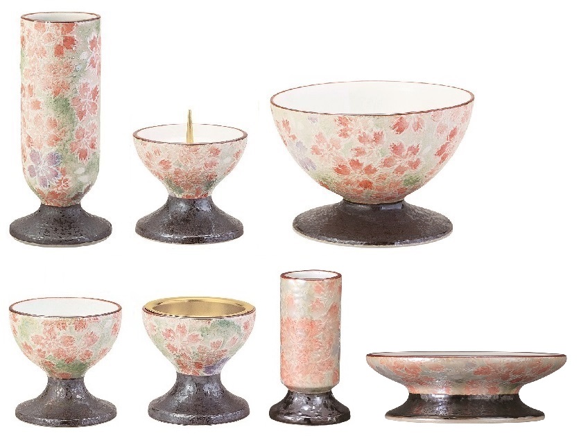 有田焼の七具足です。なでしこの図柄です。花立・火立・香炉・茶湯器・仏器・線香差(小)・供物台の7点です。