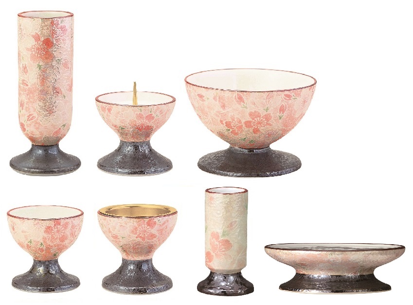 有田焼の七具足です。さくらの図柄です。花立・火立・香炉・茶湯器・仏器・線香差(小)・供物台の7点です。