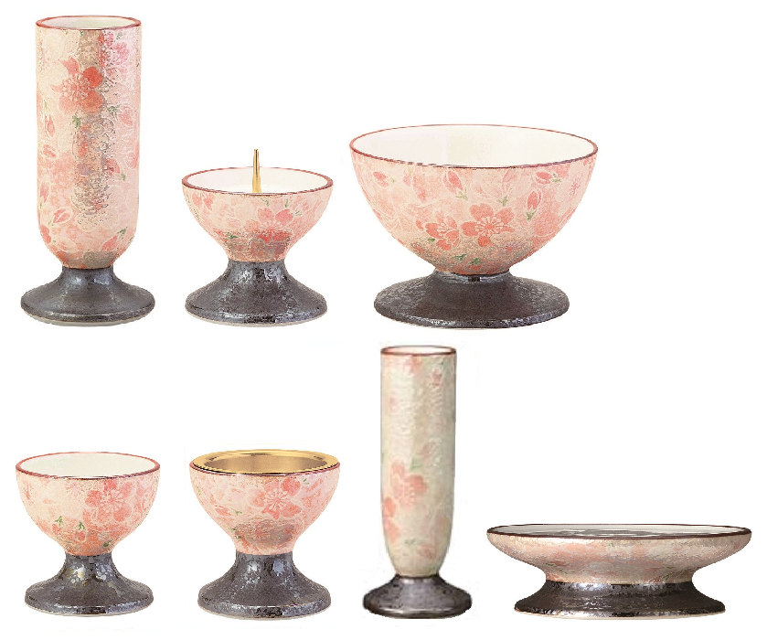 有田焼の七具足です。さくらの図柄です。花立・火立・香炉・茶湯器・仏器・線香差(大)・供物台の7点です。