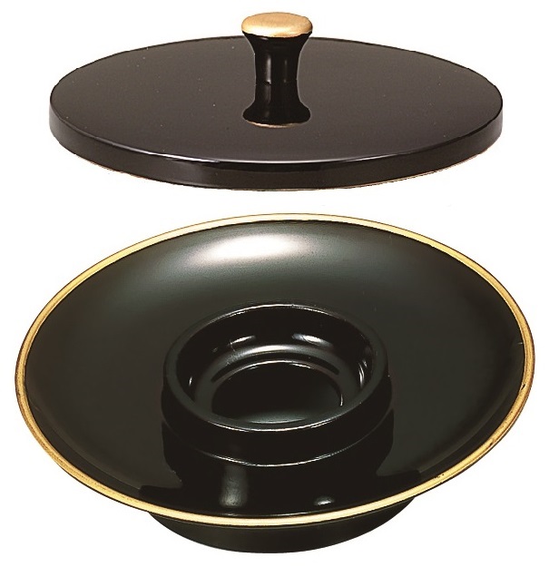 茶托フタ付【樹脂製】穴あき 黒フチ金 4寸8分