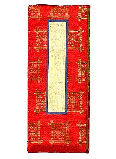 井桁に橘の紋を織り込んだ朱色の過去帳です。