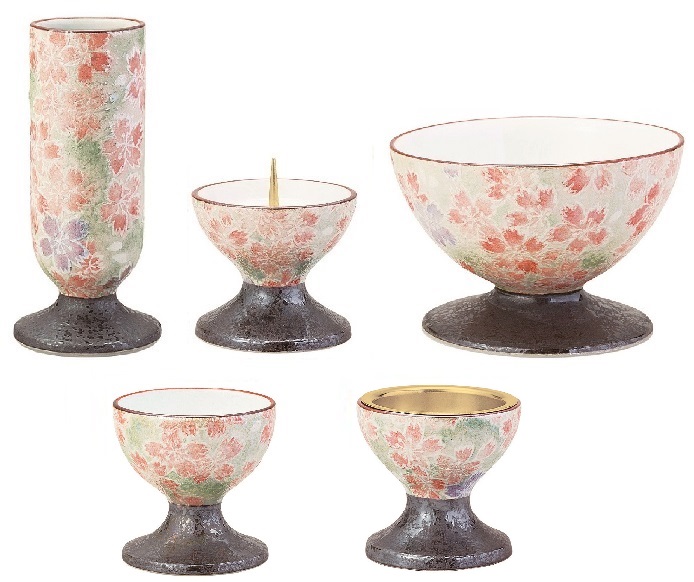 有田焼の五具足です。なでしこの図柄です。花立・火立・香炉・茶湯器・仏器の5点です。