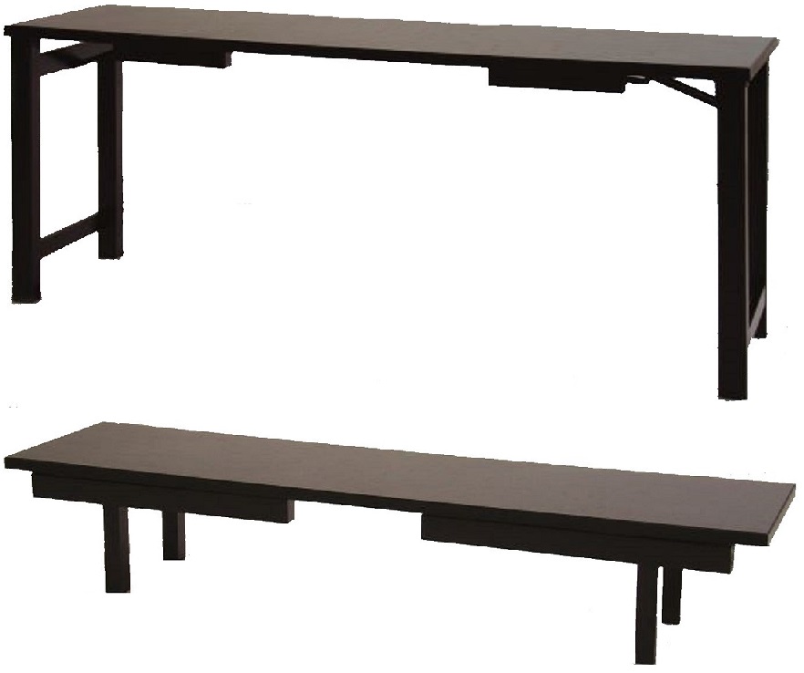 天板・脚ともに木製です。折畳(板バネ・アーム金具)式です。椅子は片側で三脚使用できます。