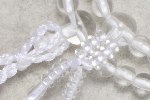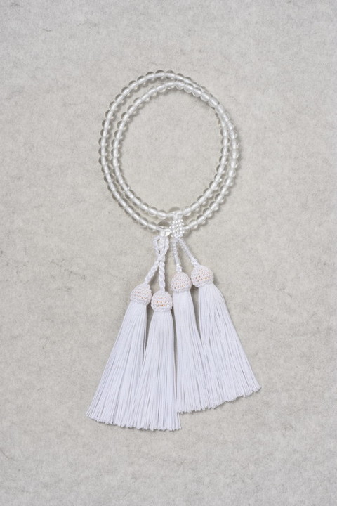 玉は水晶を模した、ガラスです。大阪和泉で一玉ずつ作る硝子玉を使用しています。道具はアクリルです。\r\n6㎜寸法切で、108玉ではござません。