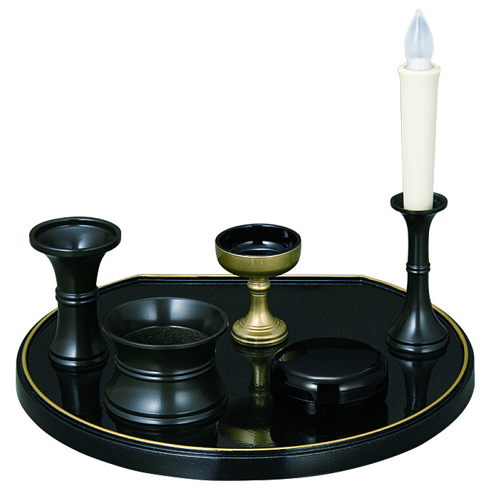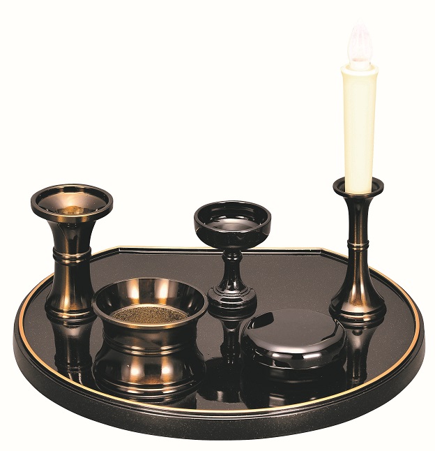 三具足一段・仏器一本・香合一個・安全ろうそく一本・専用台一枚のセットです。